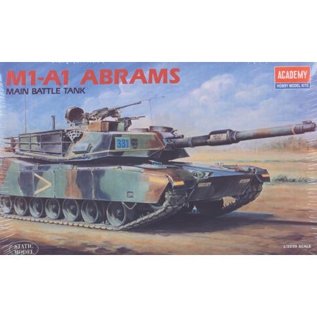 This is a 1:35 M1A1 Abrams Main Battle Tank from Academy Plastics. / It's for experienced modelers. / / Frequently described as the most advanced tank in the world, the M1A1 / Abrams is unique in that it is powered by turbine instead of diesel engines. / The tank has excellent armor protection and is also able to fire at and hit / targets while moving, due to its stabilized gun mount. The M1A1 is improved / over the original M1 and features a new 120mm main gun, increased frontal / armor, and improved environmental controls. / / FEATURES: Detailed 1:35 plastic kit for static display. / 172 parts in tan plastic with flexible vinyl rubber tracks. / Hull features fine engravings and raised weld detail. / Rotating turret with elevating gun. / Detailed road wheels; suspension arms are molded to the hull sides. / External details: spare track links, rear view mirrors, turret / machine gun, tools, antennae, headlights, hatches, mesh for turret / baskets. / Each track is a one piece molding in flexible vinyl rubber. / Optional position turret and driver hatches. / / MARKING / OPTIONS: One decal sheet with 21 marking option: / 1: #331, U.S. Army. / 2: U.S. Army. / Color Schemes: / 1 & 2: Overall Dk Green/Green/Brown/Gunship Grey camouflage. / Additional paints Required: / Flat: Black, White, Pale Green. / Gloss: Gun Metal, Silver, Red, Orange, Light Blue, Wood. / / INCLUDES: One 1:35 M1A1 Abrams Main Battle Tank / / REQUIRES: Assembly / Hobby Knife / Paint: (see MARKING OPTIONS) / Brushes / Sandpaper / Liquid Plastic Cement / White Glue / CA or Tube Type Thick Plastic Cement / Nice-to-have tools: Needle File Set, Sprue Cutter, Airbrush / / SPECS: Scale: 1:35 / Length: 8-1/2"" (21.6cm) / Width: 4"" (10.3cm)