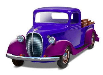 1-25 Scale. In 1937, for the first time, Ford trucks had their own styling which was distinctive from the Ford car line. Design-wise, Ford had definitely stepped ahead of the competition with its new grille, split windshield and completely redesigned cab. Stock flat head V-8 or custom manifold with dual carburetors and high compression heads, vintage truck wheels and tires or steel wheels with dog dish hub caps. 38 grille and hood, optional headlights, wood stake sides, lowered suspension, dual exhaust and surf board. Decals with factory stock and custom graphics. Molded in white, clear and transparent red with chrome plated parts and soft black tires.