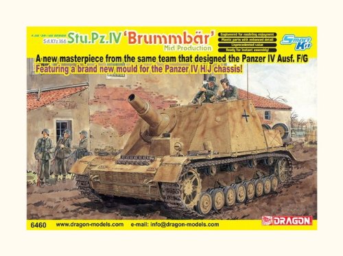 1-35 Scale.Dragon is proud to announce a brand new 1/35 scale kit of the Brummbr. It is a Smart Kit, and it was brought to fruition by the same design team that created Dragons astounding Panzer IV Ausf. F/G kits. This promises a kit that is highly accurate, and yet one that is suitable for both novice and experienced modelers. Slide molds have been widely employed to simplify assembly and to maximize the amount of detail on show. One example of this is the one-piece fighting compartment. The Mid-Production Brummbr is a popular topic for modelers wishing to portray a Sturmpanzer IV in combat. Skill level 3.