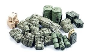 This is a plastic model that needs assembly. This set is a simple accessory set consisting of 100 parts in light beige plastic and molded to the usual Tamiya standards plus a small decal sheet with stenciling and a printed sheet with MRE packs. There is a selection of personal gear in the form of backpacks, bedrolls, rucksacks and larger rolled items to adorn the sides of vehicles plus some generic CIP panels. Kit includes 40mm grenade launcher ammunition boxes, M2 and 40mm machinegun ammunition boxes CIP (Coalition Identification Panels) Alice Packs (large and small), sleeping bags, sleeping mats, folding beds, folded tents Duffle bags, boot bags, Fritz helmets, binoculars Decals to reproduce markings on ammunition boxes